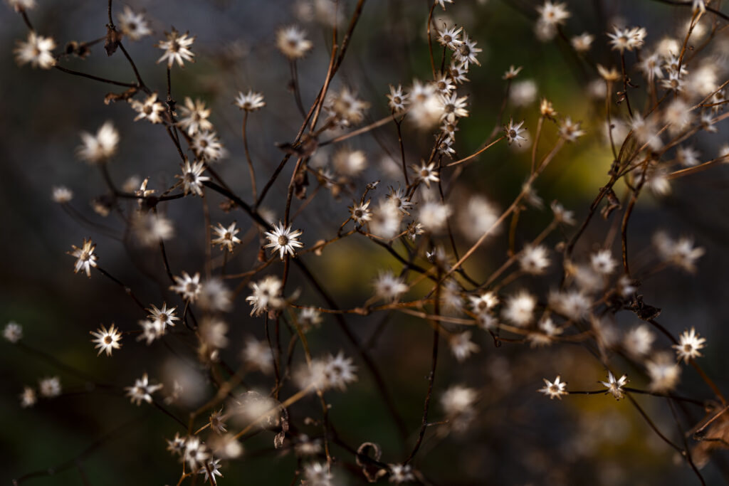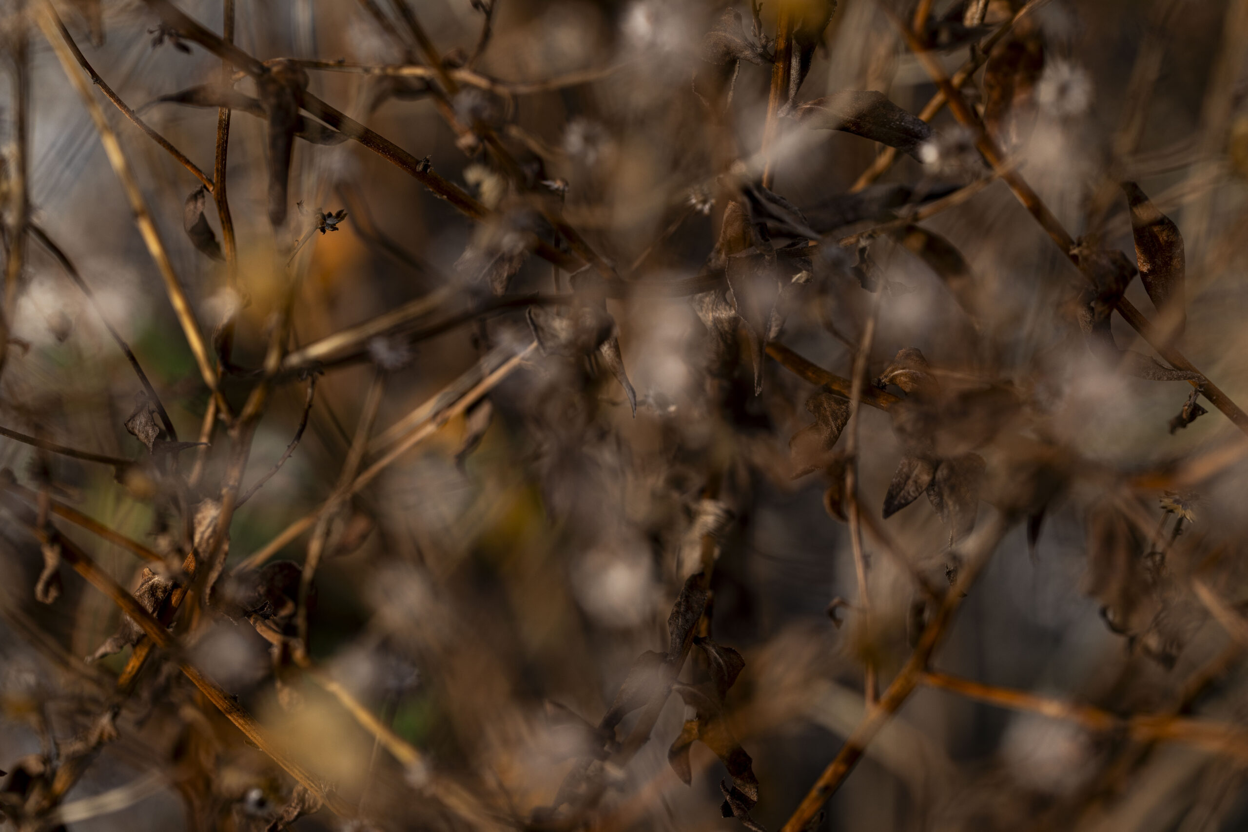 It is not necessary to travel to the ends of the world to obtain interesting images, your own back garden or balcony will do. Here are examples of some fabulous plants in their Winter state, in my own backyard. Rarely do we get this up close and personal with plants; using a macro lens in windy and poor lighting conditions allows you to see the beautiful details of these plants, and explore the random chance that a very short focal length and their continual movement brings. These two factors give an abstraction to the images that contrasts with the sharp outlines of the dead flowers in focus. Much closer to how we really experience the flowers, as our eyes flit from one to the other as the wind moves all around.